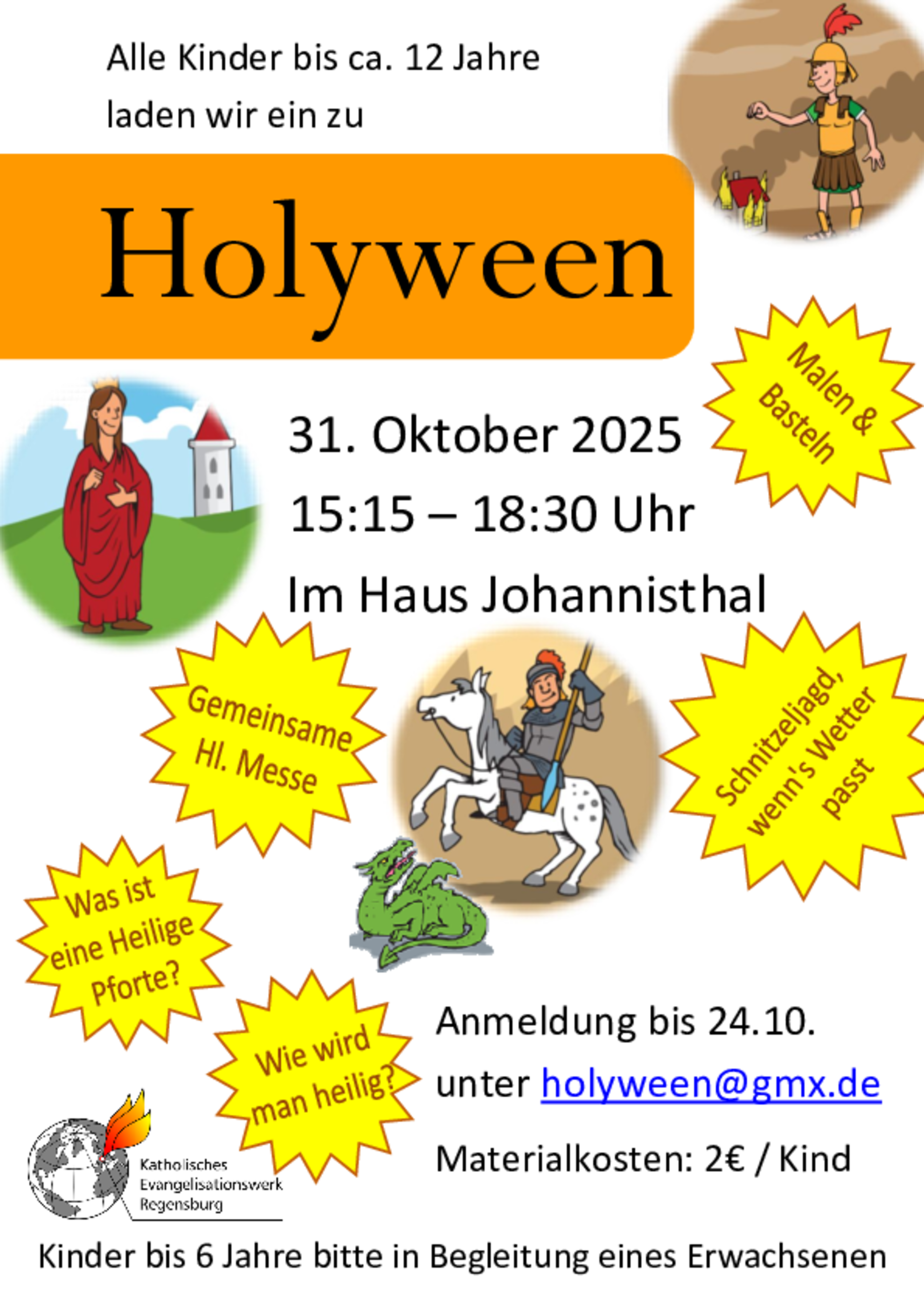 Die Alternative zu HalloweenEin bunter Nachmittag für Kinder bis ca. 12 Jahren, an dem viel geboten wird. Spannende Fragen wie z. B. “Was ist eine Heilige Pforte?” oder “Wie wird man heilig?” werden an diesem Nachmittag besprochen. Gemeinsam wird auch eine Heilige Messe gefeiert und bei guter Witterung gibt es noch eine Schnitzeljagd!